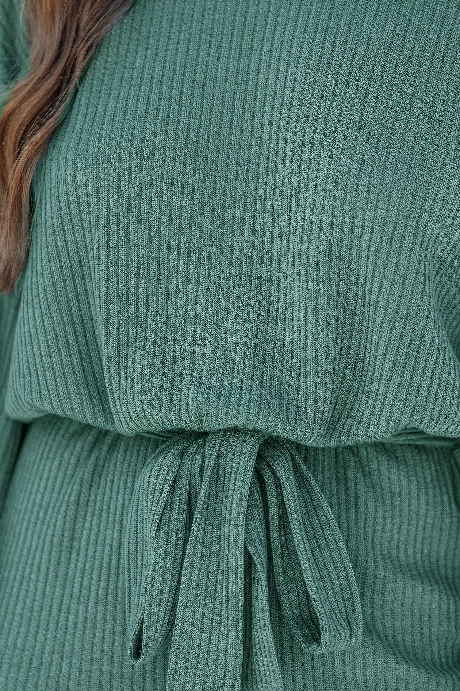 Den gröna miniklänningen Eat Your Heart Out är ren huvudkaraktärsenergi! Med rund halsringning, långa ärmar, knuten detalj och mini-skärning är den lika delar flörtig och tuff.