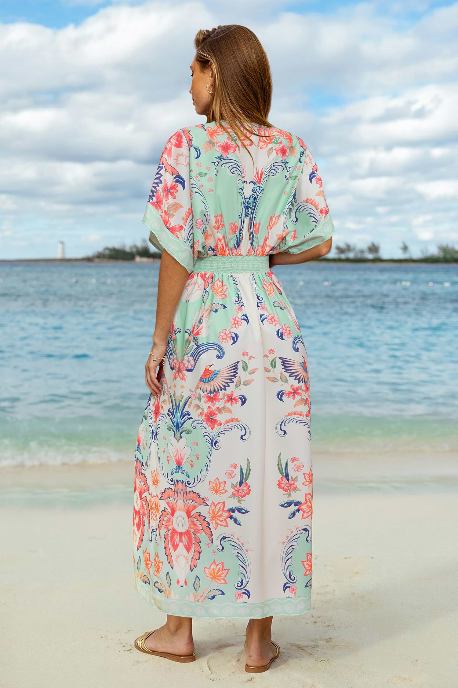 Opulence Tropical Maxi-klänningen känns fyllig och avslappnad, enkelt att sätta ihop! En smickrande V-ringning, korta ärmar, en resår i midjan och en böljande maxilängd gör den bekväm med en polerad finish.