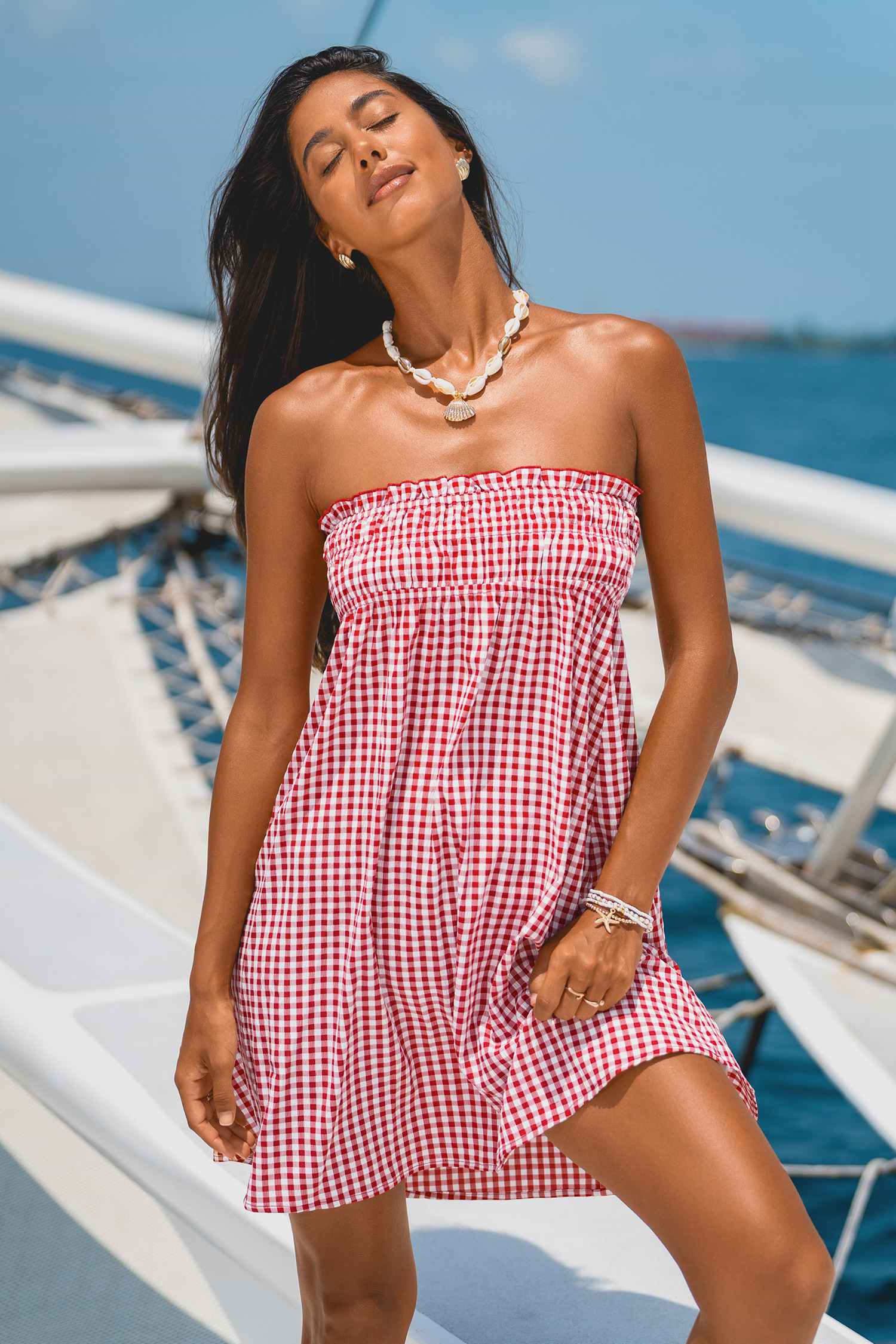 Picnic Bound Gingham Mini Dress är redo för soliga eftermiddagar och enkla planer! En rak halsringning och ärmlös skärning håller looken fräsch medan minilängden och den mångsidiga stylingen som kjol ger en lekfull finish.