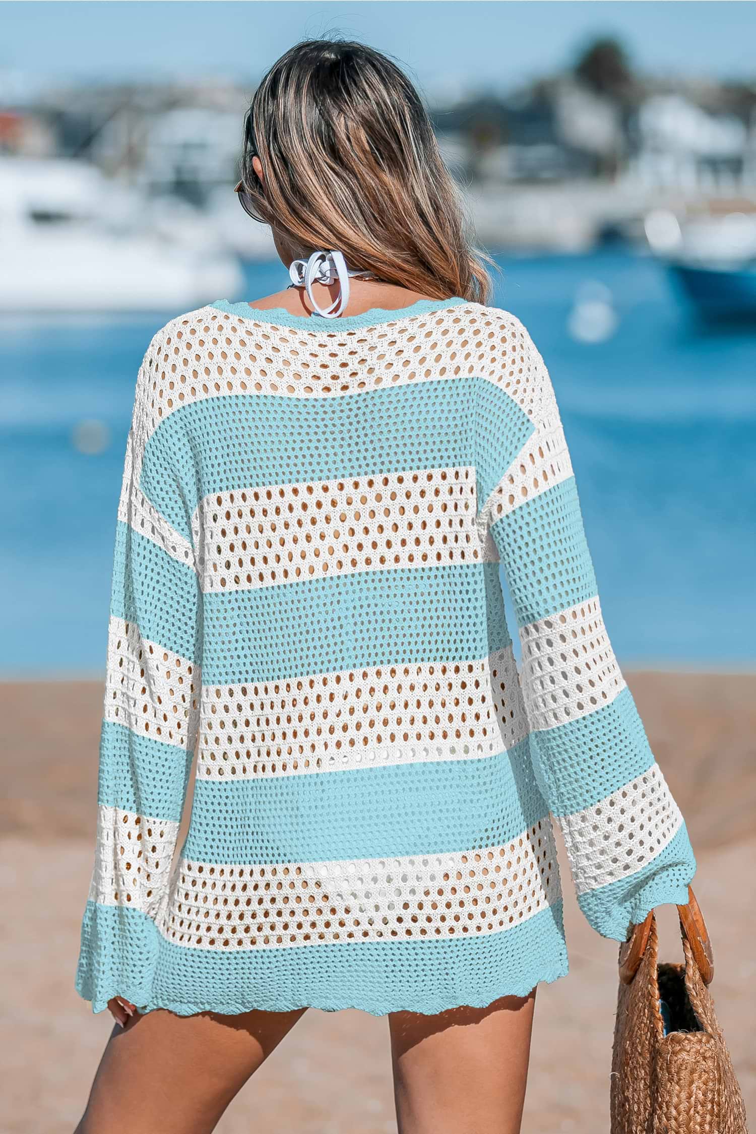 Den randiga miniklänningen med havsskumsmönster håller dig lätt och strandklar! Rund halsringning och långa ärmar slutar i en miniklänning med en vågig kant för en mjuk och lekfull touch.