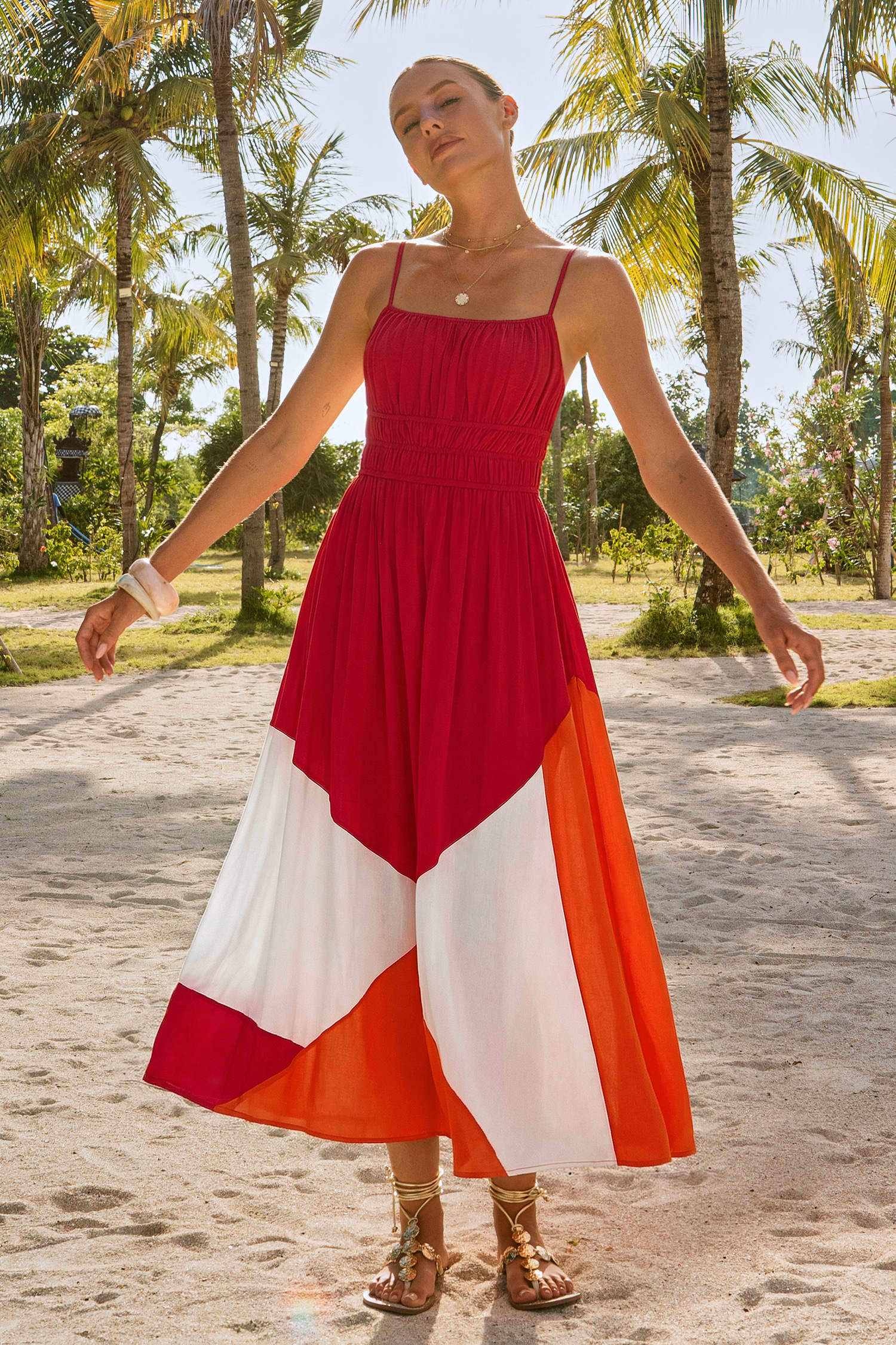 Den här Sunny Honey Colorblock Maxi-klänningen är ljus och lekfull och som gjord för att njuta av solen! En fyrkantig halsringning och ärmlös silhuett flyter över i en maxilängd för en luftig och skön passform.