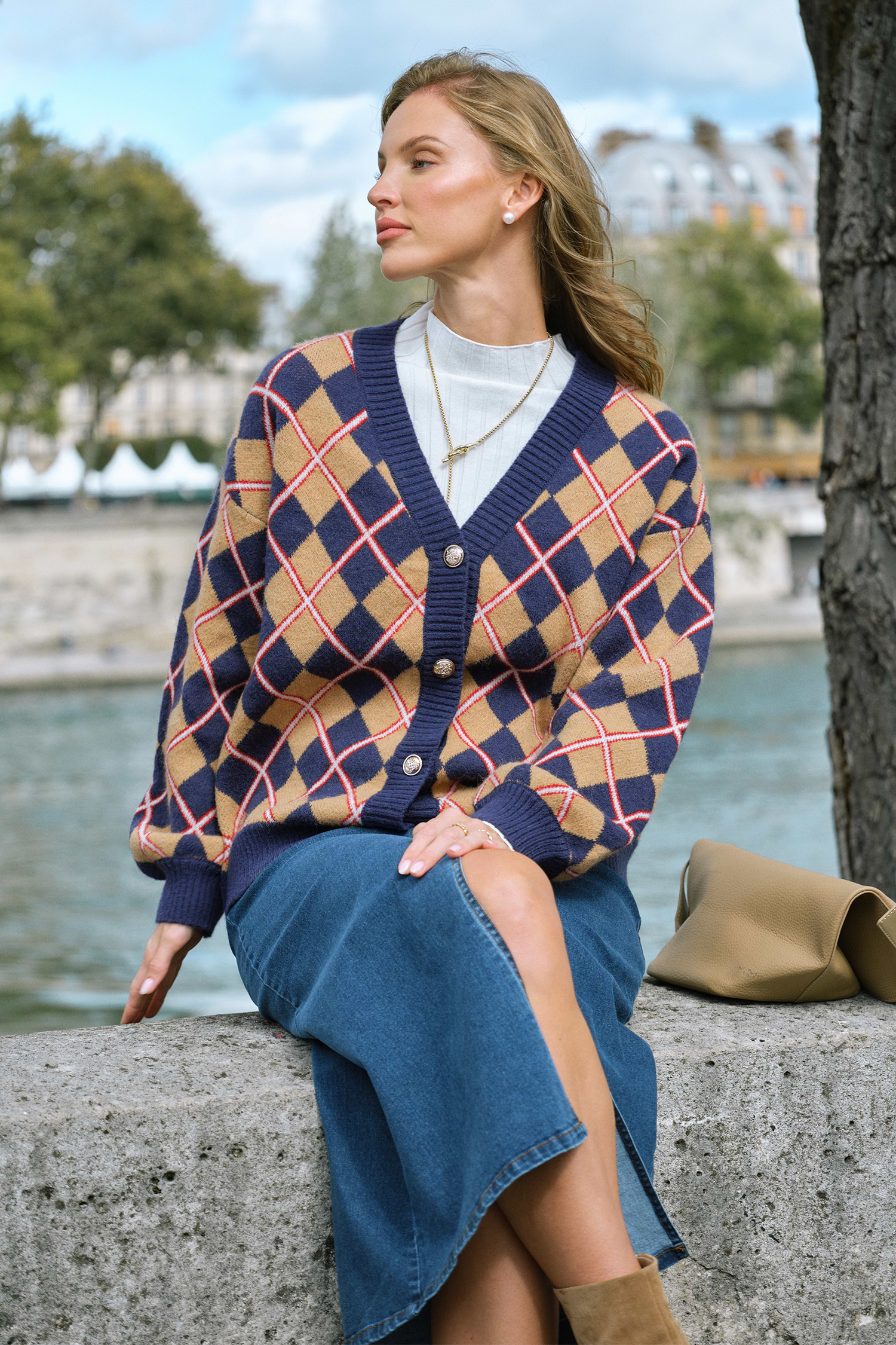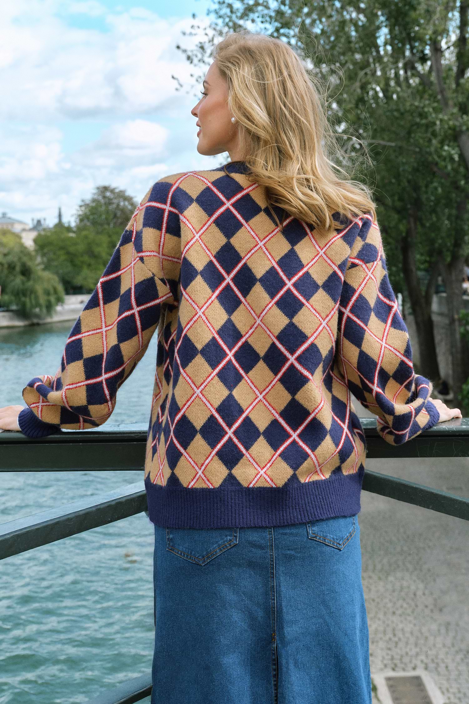 Varsity Vibes Argyle Cardigan är lekfull! V-ringning och långa ärmar gör den både tidlös och bekväm.